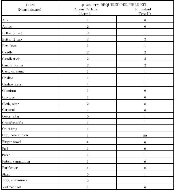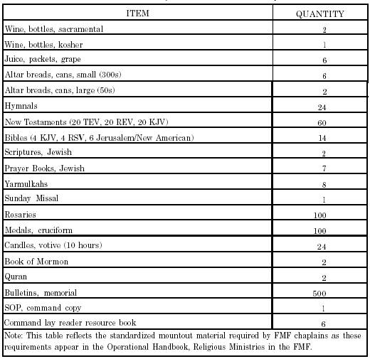 periods of religious significance that occur during deployment. The Marine Corps requires some additional ecclesiastical items and supplies for use with FMF units under field and combat conditions. The information in table 6-2 is based upon the anticipated needs of a chaplain for a 30-day emergency combat period. The ecclesiastical items and supplies that you should keep ready in a mountout box for chaplains preparing to embark on ships are listed in this table. There is no longer a requirement for a 60-day block of supplies because of the Marine Air Ground Task Force (MAGTF) operational deployment block that now accompanies all MAGTFs when they deploy. An explanation of the operational deployment block, the procedures for its use, and the requirement for 30-days' combat supplies for chaplains is explained in the Operational Handbook, Religious Ministries in the
