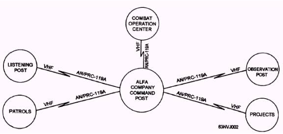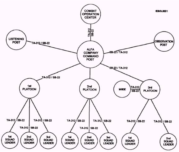 Figure 2-2.- Company CP radio plan. 2-4 28 1. Battalion Command Net One: Establish communication from the companies to the COC for administrative and logistics issues. 2. Battalion Tactical Net Two: Establish communication from the companies to the COC for tactical purposes. Used for various reports, such as SPOT, SALUTE, AMMUNITION, CAUSALITY, and SITREPS.