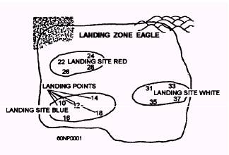 Figure 3-1.- Helicopter landing zone (LZ). LANDING ZONE/ SITE/ POINTS A helicopter landing zone (LZ) is a specified ground for landing helicopters to embark or disembark troops or cargo. A landing zone is designated by a code name. It may include one or more landing sites. Depending upon the terrain and the size of the Seabee unit, you can divide the LZ into several landing sites. A landing site is a specific location within a landing zone in which a single flight of helicopters may land to embark or disembark troops or cargo. Landing sites are designated by color, such as landing site red. A landing site contains one or more landing points (fig. 3-1). A helicopter landing point is an area within a landing site where an individual helicopter can land. Landing points are designated by two-digit numbers, such as landing point 12. For pathfinder purposes, the landing points are identified by the use of smoke or air panels. For night operations, you can mark the landing points with some type of low-intensity light. A general rule is to position landing points ten times as far from an obstacle as the obstacle is high (10: 1 ratio). NOTE: In most cases, a Seabee unit will be required to construct a landing zone with one landing site and one landing point for resupplies, troop movement, or medical evacuations. PREPARATION OF THE LANDING ZONE When planning the preparation of an LZ, you should take several factors into consideration. First, you should know what type of helicopters will be using the landing zone. The Combat Operation Center (COC) can provide this type of information. Second, you must consider the Seabee unit's position in relation to the enemy. Security troops must establish a 360-degree perimeter around the landing zone to defend the LZ. A third factor is the time it will take to prepare the landing zone. And a fourth factor considered is the equipment needed to prepare the LZ. Approaches and Exits The ground approaches to the LZ and exits from the LZ must be free of major obstacles that might obstruct landing or takeoffs, such as tall trees, telephone poles, or power lines. Approaches and exits should also be clear of obstructions that are 10 meters or higher, extending at least 50 meters in the direction of approach and exit paths. The rule of thumb for determining the distance required between the landing point and a high obstruction is a 10: 1 ratio. This means that the distance a landing point is located from a tree is ten times the height of the tree. Example: A helicopter landing or taking off near a 30-foot tree needs at least 300 feet of horizontal clearance (fig. 3-2). Ground Obstacles Obstacles on the ground, such as stumps or rocks, should not exceed 1 foot in height on level ground and should be less on sloping ground. Gradient (Slopes) Ground slope has a considerable effect on selecting a landing site or landing point within the LZ. A helicopter cannot land safely in locations where the ground slopes more than 14 degrees. When pilots land on a slope, they prefer to land uphill because of the tail down attitude of the helicopter. Surface Conditions Mud, excessive dust, and loose debris are considered undesirable surface conditions for helicopters. Mud causes a helicopter to become bogged down. Excessive dust reduces visibility and compromises the location of the site. Loose debris is dangerous because they are sucked up into the rotor blades or turbine intakes, causing serious damage. Shallow water, less than 18 inches deep and with a firm bottom, can be used as a landing site. Winds When the wind at ground level exceeds 10 knots, the helicopter must land into the wind. LANDING SITE DIMENSIONS Landing site dimensions vary, depending on the number of landing points required. For each landing point, a fuselage safe circle is cleared of all obstacles, such as stumps, rocks, or bushes. Clear a rotor safe circle of all obstacles that could obstruct the rotor blades (fig. 3-3). When there is to be more than one landing point within the landing site, separate the landing points so the helicopters can simultaneously land safely in the landing site. Use figure 3-4 as a guide in selecting the appropriate size landing zone.