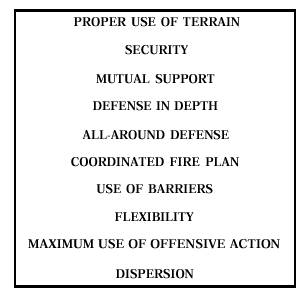 FUNDAMENTALS OF DEFENSE Effective defensive actions are achieved by a blend of the principles discussed below. The degree to which each principle applies will vary with the mission and the situation. This is decided only after consideration of all the principles (fig. 4-2). PROPER USE OF TERRAIN Maneuvers that are possible and dispositions that are essential are indelibly "written on the ground." PROPER USE OF TERRAIN SECURITY MUTUAL SUPPORT DEFENSE IN DEPTH ALL-AROUND DEFENSE COORDINATED FIRE PLAN USE OF BARRIERS FLEXIBILITY MAXIMUM USE OF OFFENSIVE ACTION