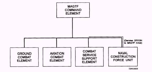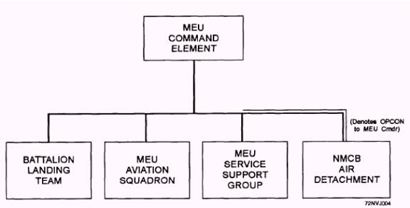 Figure 1-4.- MEU command relationships. 1. Ground Combat Element (GCE): Normally, a from the force service support group (FSSG) with battalion landing team (BLT). Only under unusual appropriate attachments from division and wing assets. cinnunstances would the GCE consist of two BLTs. 2. Aviation Combat Element (ACE): Normally, a MARINE EXPEDITIONARY composite helicopter squadron. However, in certain FORCE-FORWARD (MEF-F) instances, the ACE may consist of an attack squadron, a helicopter squadron, and elements of an observation The Marine Expeditionary Force-Forward squadron. (MEF-F) (formerly called Marine Expeditionary Brigade [MEB]) is a task organization that is normally 3. Combat Service Support Element (CSSE): commanded by a brigadier general. An MEF-F is Within an MEU, normally called a service support capable of conducting operations in low-and group (MSSG). The MSSG is task-organized primarily mid-intensity conflict environments. During potential crises, the MEF-F maybe forward deployed afloat for an extended period to provide immediate response. Under these conditions, MEF-F combat operations may be supported from the sea base, facilities ashore, or a combination of the two. The MEF-F is normally organized to wcomplish a mission of limited scope and an NMCB is normally assigned to an MEF-F. The MAGTFs elements of an MEF-F are as follows: 1. Ground Combat Element (GCE): Normally, the GCE is a regimental landing team (RLT). 2. Aviation Combat Element (ACE) Normally, the ACE is a Marine Aircraft Group (MAG) that can provide all of the functions of Marine aviation. Unlike the MEU, the Aviation Combat Element of the MEF-F is organized and equipped for early establishment ashore. Should the landing area not contain suitable airfields, an expeditionary airfield will be developed using assets organic to the MEF-F. 3. Combat Service Support Element (CSSE): The CSSE is a brigade service support group (BSSG). The BSSG is task-organized primarily from the force service support group (FSSG) with appropriate attachments from division and wing assets. MARINE EXPEDITIONARY FORCE (MEF) The Marine Expeditionary Force (MEF), the largest of the MAGTF, has many variations in its task organization structure. It is commanded by either a major general or a lieutenant general, depending on its size and mission. The MEF can conduct a wide range of amphibious and ashore operations. An MEF can be tailored for any intensity of combat and to any geographic environment. The CEC officer attached to the Command Element, engineer staff, is the liaison between the MEF engineer staff and NCF units (fig. 1-5). The regiments will be OPCON to the MEF's Command Element and all other NCF units will be OPCON to the regiments (fig. 1-6). The MAGTFs elements of an MEF are as follows: 1. Ground Combat Element (GCE): The GCE is usually a Marine division with the appropriate combat units. Certain situations may require more than one GCE in the task organization, conceivably up to two reinforced Marine divisions. 2. Aviation Combat Element (ACE): The ACE is usually a Marine Aircraft Wing task organized to conduct all types of tactical air operations. The element is designed for operations in an expeditionary environment. Certain situations may require more than one ACE in the task organization, conceivably up to two Marine Air Wings (MAWs). 3. Combat Service Support Element (CSSE): The CSSE is the force service support group (FSSG) with appropriate attachments from division and wing assets.