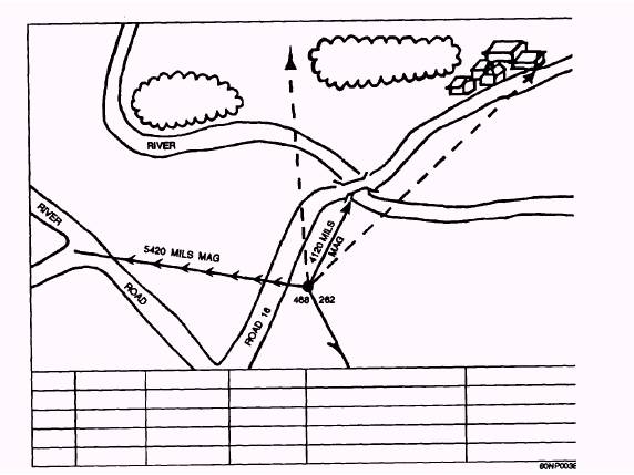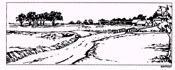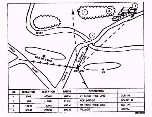 Figure 4-21.- Completed range card. Figure 4-22.- Panoramic view of tactical area. Scenario A machine gun fire team has been attached to the third platoon of Alfa Company. The squad leader and another gun team have become casualties. The platoon is deployed in a tree line overlooking a bridge. The enemy is suspected to have infiltrated the village on the other side of the river. The mission of the platoon is to stop any attempt from the enemy to cross the river via the bridge. The first platoon is to the right of the third platoon, and Bravo Company has joined the third platoon on the left. The commander of the third platoon has informed the machine gun team leader that the machine gun fire team is to be deployed on the left flank of the platoon. The team leader is to get the best angle to fire across the bridge. The team leader informs the machine gun fire team to lay the gun on a PDF centered on the bridge. The lone tree on the immediate right is the right sector limit, and the leftmost edge of the grove of trees across the river is the left sector limit. Using a compass or GPS, the machine gun fire team has located the gun at grid coordinate 468262. The grid is also 350 meters from a road junction that is located on a magnetic back azimuth of 5,420 mils. The PDF lies on a magnetic azimuth of 4,120 mils.