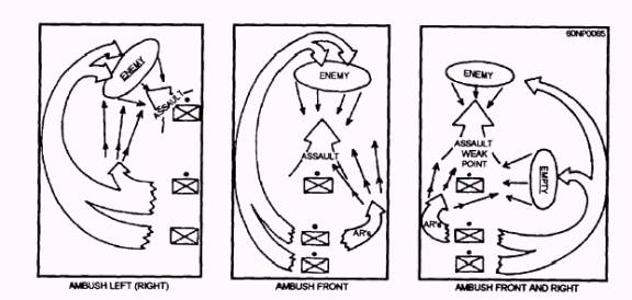 Figure 5-7.- Encircling attack. the procedures to be used for countering the different type of attacks. Active and passive defense techniques must be learned and practiced. In an ambush situation, immediate reaction and aggressive leadership are essential to limit casualties and damage to vehicles, cargo, and personnel. The following is a list of ambush instructions that was developed from lessons learned during the Vietnam War. Before Ambush 1. Be alert for changes in familiar scenes along the route. 2. Expect ambush upon detonation of mines, automatic weapons fire, and heavy sniper fire. During Ambush 1. Notify security force by radio call using prearranged signals. (Do not tie up the radio nets with unnecessary conversation. Maintain strict radio discipline.) 2. Continue moving, maintaining vehicle distance if possible. 3. Place any tracked vehicles in front to activate further detonation of road mines. 4. If disabled, steer off the road to allow passage of other vehicles. 5. If disabled and the convoy is moving through the killing zone, mount a passing vehicle. 6. Do not enter the killing zone when it can be avoided. 7. Provide flanking support fire into the killing zone. 8. Security vehicles apply maximum base of fire; fight as a team; deploy upon command. 9. Prime targets are enemy automatic weapons positions, enemy mortar, rocket positions, and assaulting ground forces. After Ambush 1. Protect and care for wounded; evacuate wounded as soon as possible. 2. After contact has been broken, reopen roadway, ensuring that it is free of mines. 3. Do not attempt to remove mines; contact explosive ordnance disposal. 4. Provide flank security while the convoy passes through the area. 5. When contact is broken, do not give chase. 6. Stay alert for a counterattack 7. Remember details.