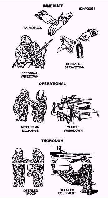 OPERATIONAL DECON The aim of operational decon is to sustain operations, reduce the contact hazard, and limit the spread of contamination. Operational decon will also eliminate the necessity or reduce the duration of wearing MOPP gear. Operational decon is done by individuals and/ or units. It is restricted to specific parts of operationally essential equipment, material, and/ or working areas. Operational decon minimizes contact and transfer hazards. Further decon may be required to reduce contamination to negligible risk levels. Two operational decon techniques are used today: . Vehicle wash down l MOPP gear exchange THOROUGH DECON The aim of thorough decon is to reduce or eliminate the need for individual protective clothing. Thorough decon is carried out to reduce