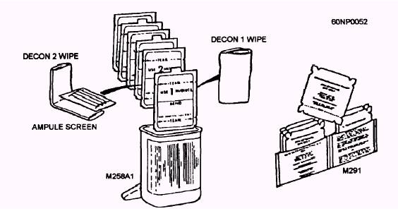 Figure 6-2.- Skin decontamination kits. WARNING Solutions in the M258A1 decon kit are flammable and unstable in storage at temperatures above 110 F (43 C) or for long periods in sunlight. Also, protect it from freezing temperatures. Used at 32 F (0 C) or below, the solution may cause frostbite. If you do not have a skin decon kit, chemical contamination may be pinch-blotted from the skin with a cloth and the area flushed with water from your canteen. Pinch-blotting is better than rubbing because it limits the spread of the contamination. Soap, if available, can also be used to wash the agent from the skin. Washing with soap and water (or hot water) is the next best method for toxic agent decon. This method is not as effective as using the decon kits. NOTE: The M291 skin decon kit replaces the M258A1 skin decon kit. However, there will still be a time when the two kits are available in the field. Currently, no means exists of detecting biological agents. You probably will not know immediately when you have become contaminated. Most biological agents, except toxins, pose their primary threat through inhalation or ingestion. The skin is an effective barrier against most biological agents if it has no cuts or scratches. Unit corpsmen know the types and levels of natural infection for the area of operations. They monitor these levels. If a given disease reaches a high level, they decide whether or not a deliberate biological attack has occurred. The best biological defense is to take action before you are attacked. Keep immunizations up-to-date, observe basic sanitary precautions, and keep skin breaks covered. Treat minor cuts or abrasions by ordinary first-aid measures (iodine, Zephiran, or Merthiolate). Washing with soap and water removes nearly all biological agents from the skin. Frequent showering or bathing lessens chances of infection and disease. A 0.5 percent sodium hypochlorite (household bleach) solution is also an effective biological decontaminant. Appendix IV tells how to make this solution. Radiological Because no immediate life-threatening hazard is caused by radiological contamination, no immediate skin decon is required. However, wash exposed areas of your skin when possible. If your skin is contaminated by radiological contamination, use operational decon techniques immediately. (See "MOPP Gear Exchange" for a detailed discussion on reducing radiation levels from radiological contamination.) PERSONAL WIPE DOWN The personal wipe down technique is most effective when done within 15 minutes of being contaminated. Every Seabee wipes down his or her mask, hood, gloves, and other essential gear. (An exception is when a thickened agent is globed on the overgarment.) For chemical and biological decon, Seabees use their skin decon kits. Radiological contamination may be brushed away. Do not attempt to remove chemical contamination from your protective overgarment. The special protective properties of the garment minimize hazards from chemical agents. However, brush off radiological, biological, or frozen chemical agent contamination from your overgarment. If radiological contamination is not removed, your radiation exposure will increase over time. Chemical The stocks and handgrips of individual weapons also tend to absorb chemical agents. Once absorbed, they may present a vapor hazard for days. To reduce this penetration and vapor hazard, decontaminate individual equipment using the M291 or the M258A1 kits. You must decontaminate gloves, hood and mask, helmet, and weapon if they are contaminated. Perform personal and equipment wipe down within 15 minutes after being exposed to liquid contamination. Additionally, wearing your Kevlar helmet protective cover will prevent or reduce the absorption of any liquid chemical agent. If an agent is globed on your overgarment, you may scrape it off with a stick or other object; otherwise, do not attempt to decontaminate chemical agents on your overgarment. This will provide little, if any, extra protection and you probably will not have enough M291 and M258A1 decon wipes to do so. Decon wipe 1 works better against the G-type of nerve agents but can burn your skin. Decon wipe 2 works better against CX-type of nerve agents and blister agents. Additionally, decon wipe 2 is not as caustic to the skin and should help to neutralize some of the caustic compounds in wipe 1. When M291 and M258A1 decon wipes are not available, field expedient methods, such as washing with soap, water, and bleach solution, are partially effective (see appendix V). Biological If you know or suspect toxins or other biological agents are present, remove the contamination with soap and water. If water is not available, use M258A1 decon wipes in the same manner as described for chemical agent decon. Radiological contamination can readily be detected and located with monitoring equipment. Remove the contamination and you reduce the hazard. Brush the dust off your load-bearing equipment and mask carrier. If you are contaminated with a dry contaminant, such as fallout, shake your clothing and gear. Wash the exposed areas of your skin. Use M258A1 decon wipes if soap and water are not available. Pay particular attention to your hair and fingernails. Avoid breathing the dust you shake off by wearing a piece of cloth over your face. If you were contaminated by a wet radiological contaminant, you must immediately conduct a MOPP gear exchange. Brushing or shaking will not remove the wet radiological contaminant or its hazard. Wipe off your mask, hood, helmet, gloves, footwear covers, and other personal equipment with warm, soapy water. If warm, soapy water is unavailable, use rags or damp paper towels. Ensure contamination is not spread to clean areas.