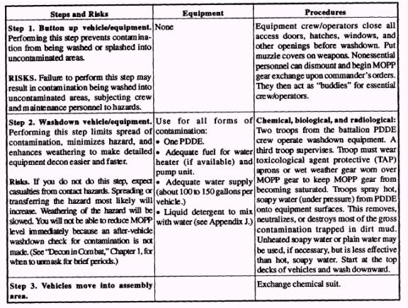 This phase is the actual conduct of the two operational decon techniques: the vehicle wash down and the MOPP gear exchange. Companies will provide their own security while vehicle wash down and MOPP gear exchange are in progress. When finished, troops mount their vehicles and move to their new battle positions. For planning purposes, the vehicle washdown site will process one vehicle every 2 to 3 minutes; and MOPP gear exchange will take approximately 30 minutes. Vehicle Wash Down Before vehicle washdown, units conduct the operator's spray down to increase decon effectiveness. Ensure that water pressure is from 60 to 120 psi; the pressure rate at which most gross contamination can be removed. Vehicle wash down is conducted as far forward as possible and is done by the battalion decon crew. The decon crew will use the power-driven decon equipment (PDDE) currently available in the TOA to conduct vehicle wash down, such as the M12A1 or M17 power-drive decon apparatus (PDDA). If the mission permits, it is most effective to conduct vehicle wash down between 1 to 6 hours after contamination. The longer you wait to remove or neutralize contamination, the harder it will be to do so. Also, the longer you wait, the more opportunity there will be for agents to spread and make contamination problems worse. Each vehicle receives a 2-to 3-minute vehicle wash down with hot, soapy water from the PDDE. Vehicle operators maintain visual contact with each other to know when to move from concealment to the washdown area. The PDDE operator gives a signal when vehicles are required to move into position. Personnel in wheeled vehicles should dismount before wash down to avoid getting wet. Following this, the vehicle moves to the MOPP gear exchange area. Troops will dismount and conduct MOPP gear exchange by squad or vehicle. Depending on the availability of equipment, METT-T, and the tactical situation, units have the option to select a one- (table 6-1 and fig. 6-4) or a two-lane wash down. When using two M12A1 or other combinations of decon equipment, two-lane operational decon speeds up the process (table 6-2 and fig. 6-5). Because speed is important and detection is difficult, do not check vehicle for contamination after vehicle only gross contamination. wash down. Remove Mopp Gear Exchange Mopp gear exchange is done by squads or crews so that leaders can control the rate of overgarment exchange. This procedure also ensures that adequate stocks of overgarments at company level are maintained and accounted for. Two Seabees can work as a buddy team, or a Seabee can execute the technique by himself. However, when squad leaders supervise, they can prevent unnecessary exchanges of MOPP gear by using the chemical agent monitor (CAM). During the MOPP gear exchange, you change your contaminated MOPP gear for new, uncontaminated gear. The squad or platoon is responsible for conducting its own MOPP gear exchange at the assembly area of the operational decon site. Decontaminants and chemical suit replacements are provided by supply (S-4) and issued near the decon site. MOPP gear exchange removes nearly all liquid or solid contamination from you and your individual equipment. When personnel have little, if any, vapor hazards on themselves, they may use hazard-free areas to unmask, to eat, to drink, and to rest temporarily. Before unmasking and lowering MOPP levels for temporary relief, conduct unmasking procedures using the CAM. Eight steps are used in MOPP gear exchange. The squad forms a circle around a lead team, typically the squad leader and another Seabee. The troops are paired into buddy teams and spaced around the circle with 1 to 3 meters between teams. Members of each team alternate as they go through step 1 (decon gear). At steps 2 through 7, one member completes all steps with the assistance from the other team member. Roles are then reversed. See table 6-3 for detailed instructions on this method. These techniques do not guarantee safe conditions required to allow unmasking on or near equipment. However, troops may move upwind of dirty vapor equipment into a clean area or collective protection shelter, check for contamination, and then briefly unmask. Conduct continuous contamination checks and monitoring to ensure you stay in clean areas. Use the M258A1 kit and check it every 15 to 20 minutes. Use the CAM every 5 minutes. Use the CAM together with unmasking procedures. Three types of procedures are used for MOPP gear exchange: buddy team, triple buddy system, and individual MOPP gear exchange. Table 6-1.-
