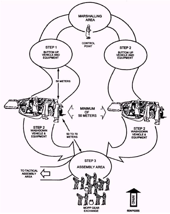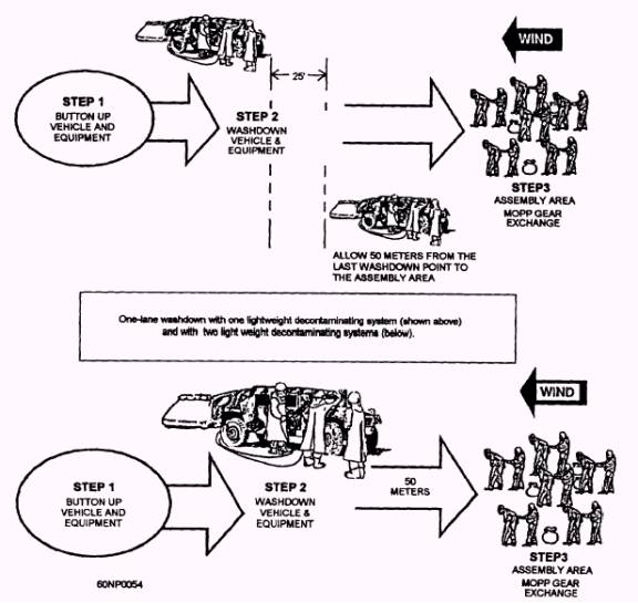 Figure 6-4.- One-lane wash down. MOPP gear exchange concurrently. This should be done between 1 to 6 hours of becoming contaminated. This action reduces degradation and improves the ability of the unit to conduct its mission. Decontaminants and replacement MOPP gear are provided by the supply company with a vehicle near the decon site. MOPP gear exchange and vehicle wash down are best used by squad-size or platoon-size elements. When larger elements try to process through an operational decon site, they lose many benefits of a small decentralized operation. Benefits of a squad-or platoon-sized decon operation include the following: 1. Tailored decon operations are flexible and responsive to small unit needs. 2. Small, speedy operations are more easily concealed in one location near the forward area. 3. A water source may not be needed at the decon site because most power-driven decon equipment (PDDE) have a water-carrying capability to support squad-sized elements. Units must develop their own Standing Operating Procedure (SOP) for obtaining temporary relief from MOPP 4. The SOP is based on each unit's equipment and mission. Although every operation is unique, methods should be standardized when possible. In any case, personnel must know the following: Table 6-2.-