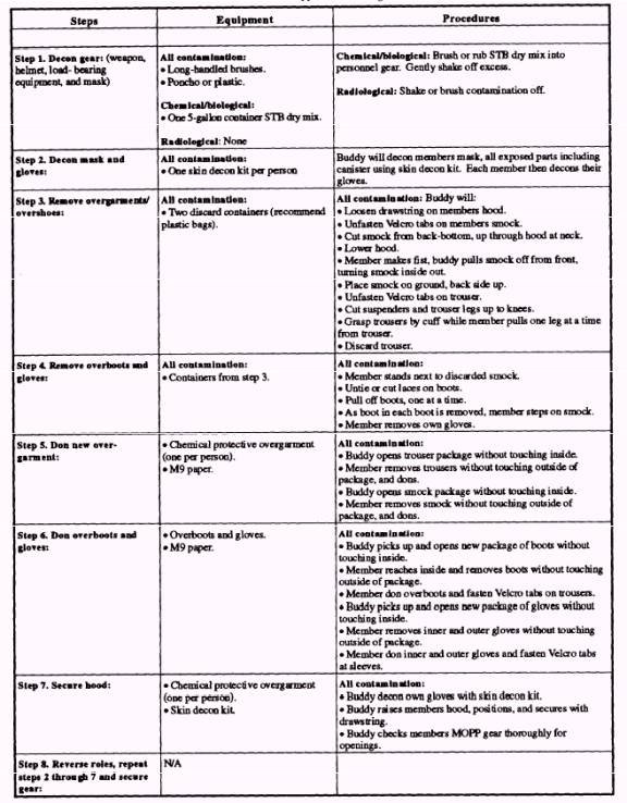 Two-Lane Wash Down 1. How to recognize and understand contanim-4. Know how to neutralize or remove contamina-tion hazards and how to avoid contamination when tion hazards. possible. 5. Do only as much decon as you need to continue 2. How to protect yourself and your equipment if your mission. contaminated. The following sample checklist (table 6-4) can be 3. Know the capabilities and limitations of MOPP used by the battalion decon team for planning gear. operational decon operations: