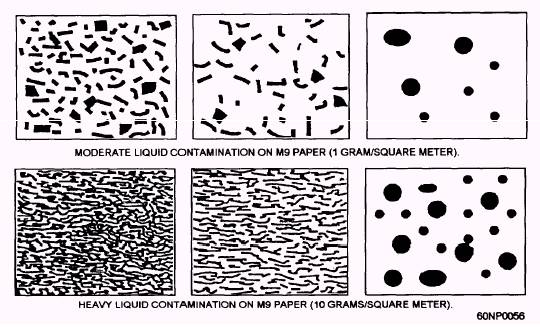THOROUGH DECON OPERATIONS Thorough decon operations reduce contamination to negligible risk levels. They restore combat power by removing nearly all contamination from unit and individual equipment. Thorough decon enables troops to operate equipment safely for extended periods at reduced MOPP levels. A small risk remains, so periodic checks with the CAM, M8/ M9 paper, or M256-series kit must be made after each operation. After thorough decon, the unit moves out of the decon site into a tactical assembly area. The unit, while in this tactical assembly, may undergo reconstitution or prepare for future operations. Operational decon requires fewer resources but physically removes only surface contamination. Thorough decon is the most effective type of decon Weather conditions, agent used, mission requirements, time, troops, and supplies available may all combine to make weathering the decon option of choice. Based on the recommendation of the CBR officer, the COC decides which type of decon is the most efficient and effective for their unit. A limiting factor that must be considered when planning any decontamination operations is the availability of water. A typical vehicle will require 500 gallons of water during detailed equipment decon. In a water-scarce environment, such as deserts, the CBR officer must cordinate a water resupply plan with other units in the area of operation. A water resupply plan can include selecting a series of link-up points along a route. The unit can link up with a bulk water truck from other units. More complex water resupply plans include linking up with bulk water trucks, caching water throughout the area of operations, coordinating for the movement of water bladders by aircraft, and the identification of water sources in the area of operation of the unit. The use of nonpotable, salt, and brackish waters should be considered. The thorough decon site consists of four main areas: the predecon staging area, the postdecon assembly area, the detailed troop decon (DTD), and the detailed equipment decon (DED). Selection of all four areas are based on operational guidance, road network, available cover and concealment, and water supply. The predecon staging area is used by the contaminated unit to ready them for detailed equipment decon (DED) and detailed troop decon (DTD) operations. The process at the DED includes removing, neutralizing, or reducing contamination on interior and exterior surfaces of equipment to negligible risk. The DTD is the process of decontaminating individual fighting equipment to negligible risk and removing contaminated MOPP gear from the troops. The postdecon assembly area is the location where vehicles and troops exiting the DED and DTD are linked. This is done before moving from the decon site. PREDECON STAGING AREA The contaminated unit, by company, moves to a predecon staging area approximately 250 to 500 meters downwind of the thorough decon site. Here, the contaminated unit conducts the required predecon actions that are designed to prepare the unit for the thorough decon operations. Predecon actions include the following: 1. Segregate contaminated vehicles from uncontaminated vehicles, if possible. 2. Allow vehicle crews to dismount and prevent further transfer/ spread of contamination. 3. Prepare vehicles for detailed equipment decon. 4. Move contaminated vehicles and troops to the detailed troop and equipment decon lines. Segregate Vehicles Check all vehicles for contamination, using detection equipment. For chemical contamination, use the CAM and M8 detector paper. Also, visually check the vehicles for contamination using M9 paper. M9 paper affixed to vehicles reveals the presence of contamination and provides an indication of the level of contamination (fig. 6-6).