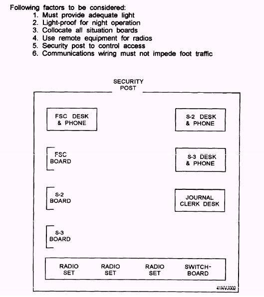 Figure 1-8.- Internal arrangement of COC. and training COC watch stander personnel. Personnel are kept to a minimum to simplify operational efficiency. The following watch sections are manned on a 24-hour basis: Intelligence Watch Officer (S-2) Provides complete supervision of handling and processing information relating to intelligence. Gathers and distributes information gained from intelligence (INTEL) sources. Prepares written and oral briefings as required. Maintains overlays for the enemy situation map (INTEL MAP). Promptly informs the operations officer (S-3) of significant or unusual incidents. Supervises the maintenance of the intelligence situation bead, such as enemy and friendly updates. COC Watch Officer Before assuming watch, reads message board, is briefed on the present situation from the current COC watch officer, and makes liaison with other staff sections. During watch, keeps current on the tactical situation, makes routine decisions, and notifies S-3 of incidents of an unusual nature. Reads all incoming and outgoing messages. Takes action by delivering messages to the cognizant section and ensures the appropriate action is taken. Has releasing authority on all outgoing messages.