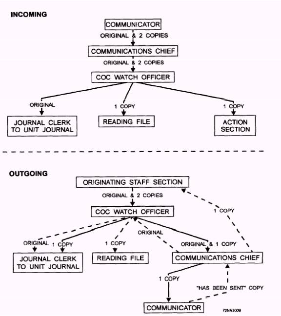 OPERATION OF THE COMBAT OPERATION CENTER Once you know the units within your area of operations, who you are OPCON to, and have established a communication network, a Standard Operating Procedure (SOP) instruction for the Combat Operation Center should be prepared. All key personnel involved with the operations of the COC should be involved. Special consideration must be given to message handling procedures, situation boards, unit journal, fire support coordinator, and staff briefings. NOTE: The following paragraphs contain a typical SOP for the Combat Operation Center. The one you may be tasked to design maybe different but should contain the same basic topics. INCOMING MESSAGES All incoming radio traffic will be written down on authorized message pads with an original plus two copies (fig. 1-11). A guide for handling messages is as follows: FLASH: Not fixed. Handle as fast as humanly possible; objective is less than 10 minutes. IMMEDIATE: 30 minutes-1 hour. PRIORITY: 1-3 hours. . ROUTINE: 3-4 hours or start of business on the following day. The message is passed to the communication chief who checks the message for form at, spelling, and legibility. After checking the message, the communication chief passes the message with all copies to the COC watch officer. The COC watch officer assigns the action as appropriate and indicates the action section on the message, such as FSC and S-2. The watch officer gives the original to the journal clerk for logging, gives one copy to the action section, and places one copy on the reading board. Incoming messages received by runner or field telephone are handled in the same manner as incoming radio messages, except they are delivered to the COC watch officer without routing through the communication chief. OUTGOING MESSAGES The originating staff sections, such as FSC and S-2, prepare an original and two copies of each message prepared. All copies are passed to the COC watch officer. The COC watch officer reviews the message, signs the releasing block, and passes one copy to the journal clerk for logging. The COC watch officer then gives the original plus one copy to the communication chief. The communication chief passes one copy to the communicator. After transmission, the communicator returns this copy with the time of transmission indicated back to the communication chief. The communication chief returns a copy to the originator. The COC watch officer gets the original with the time of transmission noted. The original is then placed on the outgoing reading board after the journal clerk logs the time of transmission. SITUATION BOARDS Each cognizant staff section, such as Ops and INTEL, is responsible for maintaining current situation maps and other tactical information aids. Close monitoring of the developing tactical situation is required to ensure that request for support or information are provided expeditiously. The COC watch officer should ensure that any information requiring the updates of maps or charts is forwarded to the staff sections rapidly.