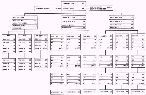 The company headquarters of a Seabee company consists of the company commander, an assistant company commander when assigned, the company chief, a company guidon, a company clerk a company messenger, and other administrative assistants as required. The company headquarters varies somewhat in each company, depending on its construction/combat missions. Figure 1-8 shows the organization of military support in the construction/rifle companies. The rifle company commander is usually a lieutenant in the Civil Engineer Corps who is responsible for commanding his company by following the policies of the commanding officer.