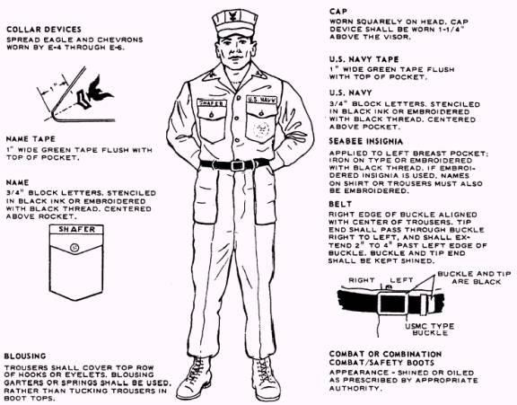 CLOTHING (STANDARD ISSUE) The initial allowance of utility uniforms will be issued to you when you check into your unit. These items remain the property of the government; however, you are responsible for their proper upkeep. When an item wears out through normal use, it will be replaced at no cost to you by the supply section of the unit. Always ensure that your clothing is in good condition before deploying to an overseas destination where the supply of these items maybe limited. Current instructions recommend that the standard MINIMUM OUTFIT issued to each person consist of the following: 1. Six utility shirts 2. Six pairs of utility trousers 3. Three caps 4. A cold weather coat (field jacket) 5. Two pairs of combination combat/safety boots All items of clothing are to be marked in the following manner: 1. Utility shirts. When these shirts are issued, a 1-inch-wide green tape must be sewn above each pocket flush with the pocket seam. These tapes are the full width of the pocket, except that some personnel with long surnames may require tapes wider than the pocket. In addition, an iron-on type of Seabee insignia must be applied to the center of the left breast pocket (fig. 2-1). Your last name must be stenciled in black stencil ink or black paint in 3/4-inch block letters on the tape above your right breast pocket. The tape above your left breast pocket must be stenciled in the same manner with the words U.S. NAVY centered above the pocket. As an alternative to stenciling, block letters may be embroidered with black thread. The Seabee insignia may also be embroidered on the pocket, but the sew-on patch is not authorized. 2. Utility trousers. A name tape similar to that sewn above your right breast pocket must be sewn over the rear right pocket. 3. Caps. Utility caps should be stenciled with your initials only on the sweatband. 4. Boots. Each boot should be stenciled with your initials on the inside near the top. 5. Belt. The black web belt should be stenciled in white ink with your last name and initials on the end nearest the buckle. 6. Cold weather coat. This coat, commonly called a field jacket, is issued to you. The field jacket is to be stenciled in the same manner as the green shirt.