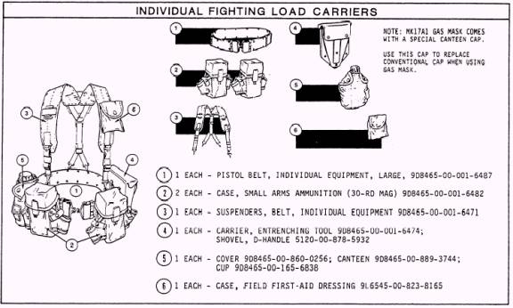 Figure 2-2.-Load-carrying equipment. Construction Ratings (Seabeds) and non-occupational field 13 personnel serving with the NCF. The belt should be worn with the right edge of the buckle aligned with the center of the trousers and with the metal-tipped end passing through the buckle to your left, approximately 2 to 4 inches (fig. 2-1). The metal-tip and buckle are black. 6. Cold weather coat.When the coat (field jacket) is worn with the green utility uniform, all of the buttons except the top or collar button must be buttoned. 7.