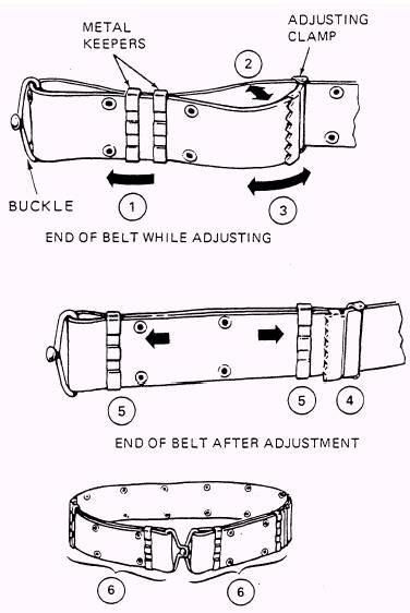 the Pistol Belt First, try on the belt for size. It should be comfortable y snug-not tight. The following six steps in adjusting the pistol belt correspond to the six actions shown in figure 2-3: 1. Push the two metal keepers between the adjusting clamp and the belt buckle toward the buckle. 2. Unlock the adjusting clamp by spreading the looped webbing apart. 3. Slide the clamp toward the belt buckle to loosen or away from the buckle to tighten.