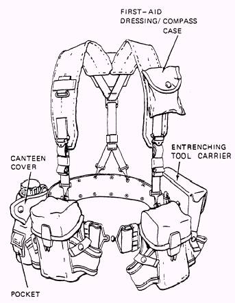dressing/compass case. 6. Attach the front suspender straps to the eyelets on either side of the belt buckle when the ammo pouches are not used. When M-16 ammo pouches are used, attach them to the suspenders, as shown in the sketch. Attaching