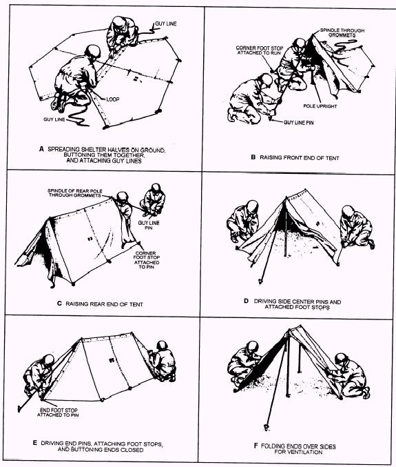 the proper procedures to follow in pitching the two-man shelter tent.) Six