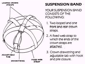 2-31.-Suspension band. l Headband l Chin strap HELMET SHELL.- The helmet shell (fig. 2-30) comes with suspension band and chin strap installed It is worn for protection against fragmentation from artillery fire, grenades, and ricocheting bullets. The helmet may be worn over the watch cap or over/under the poncho hood. Although the helmet is a sturdy item and can withstand rough treatment, the following safety procedures should be observed: l Do not use the helmet to heat water for cooking or for hygienic purposes. . Do not use the helmet as a shovel, hammer, or any other kind of tool. l Do not place heavy objects on or sit on the helmet. |