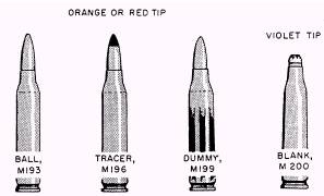 AMMUNITION FOR THE RIFLE The 5.56-mm ammunition, as shown in figure 3-26, for the M16 rifle is classified as small arms ammunition and is issued in the form of a complete round. A complete round (cartridge) consists of all the components necessary to fire the weapon once; that is, Figure 3-26.-5.56-mm ammunition for the M16A1 and M16A2 rifles. projectile (bullet), propellant, and primer. Based upon the type of projectile, the ammunition for use in the rifle is classified as follows: 1. The ball cartridge, M193, is for field use and has no distinguishing marks. When shot from the rifle, its muzzle velocity is approximately 3,250 feet per second. It has a maximum range of 3,000 yards, but the maximum effective range is 500 yards. 2. The tracer cartridge, M196, is used to observe fire and for incendiary effect. You can identify it by an orange- or a red-painted tip, depending on the ammunition lot number. The use of only tracer cartridges may cause deposits of the bullet-jacket material (metal fouling) to form in the bore and rifling grooves of the barrel. These tracer deposits are extremely difficult to remove and are a potential safety hazard. Therefore, when tracer ammunition is fired in the M16 rifle, you should intermix it with ball ammunition in a ratio of no less than four ball rounds to each tracer round. 3. The dummy cartridge, M199, cannot be fired. You can identify it by six lengthwise ridges in the case. The dummy cartridge is for use in training only. 4. The blank cartridge, M200, is for use in training and ceremonial salutes. Its case mouth is closed with a rosette crimp that has a violet tip. You can identify it by the knurled band around the lower portion of the case. The grooves help identify the types of cartridges by feel when you cannot see the colored tip in the dark |