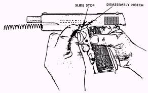 5. SLIDE STOP. Hold the pistol as shown in figure 3-33. Look through the slide