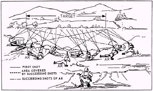Figure 3-67-Fire distribution by individuals of the rifle squad. The platoon commander's order to his or her section of squad leaders assigns a mission to each section or squad; gives the firing position area each squad will occupy and the targets it will engage; or the sector of fire it will cover. In addition, he or she frequently prescribes the technique to use in engaging targets. The section or squad leader's order prescribes the location for each weapon, the targets, and the technique to be used. In the absence of orders from the next higher commander, the platoon, section, or squad leaders regulate opening fire and lifting, shifting, and rate of fire. |