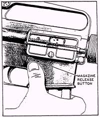Figure 3-6.-Removing the magazine. An ejection port cover prevents sand and dirt from getting into the ejection port. It should be closed during periods when firing is NOT anticipated and will open by either forward or rearward movement of the bolt carrier. The M16A2 is an improvement over the M16A1 in the following ways: . The barrel is 3 to 4 ounces heavier. The new barrel spins the bullet one turn in 7 inches, compared to one turn in 12 inches by the M16A1. l The Ml6A2 has a maximum effective range of 800 meters, compared to 500 meters for the M16A1. l The front sight post is now square instead of round, making it easier to see. l The new model no longer fires full y automatic; it fires three rounds only per burst in the automatic setting. l Left-handed shooters have some protection from injury with a built-in brass deflector located at the rear