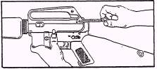 Figure 3-8.-Locking the bolt open. of the ejection port. The stock of the rifle is 5/8 inch longer, making it more comfortable and easier to handle. Unless specifically stated otherwise, the following discussion of the M16 rifle applies equally to both the M16A1 and M16A2. For economy in communication, the following maintenance procedures (clearing, field-stripping, assembling, etc.) for the M16 service rifles are written for the right-handed Seabee. The left-handed Seabee can reverse hand directions for these procedures if it improves their efficiency. |