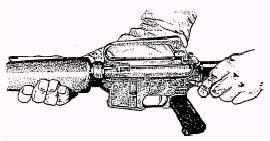 CLEARING THE RIFLE The first precaution to take in handling any weapon is to make it safe by clearing it. To clear the Ml 6 rifle, place the butt against the right thigh and proceed as follows: 1. Attempt to point the selector lever toward SAFE, the position shown in figure 3-5. If the weapon is not cocked, the selector lever cannot be pointed toward SAFE. If that is the case, do not cock the weapon at this time; instead, go on to the next step in clearing. 2. Remove the magazine, as shown in figure 3-6. Grasp it with the right hand (fingers curled around the front of the magazine, thumb placed on the magazine catch button). Apply pressure on the magazine catch button with the thumb, and pull the magazine straight out of the weapon. 3. Lock the bolt open, as shown in figures 3-7 and 3-8. Grasp the charging handle with the thumb and