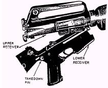 Figure 3-10.-Breaking upper receiver away from lower receiver. forefinger of the right hand, depress the charging handle, latch it with the right thumb, and pull to the rear (fig. 3-7). When the bolt is fully rearward, press the bottom of the bolt catch with the thumb or forefinger of the left hand (fig. 3-8). Allow the bolt to move slowly forward until it engages the bolt catch, and return the charging handle to its forward position. 4. Inspect the receiver and chamber of the weapon, by looking through the ejection port, to ensure these spaces contain no ammunition. 5. Check the selector lever to ensure it points toward SAFE; then allow the bolt to go forward by depressing the upper portion of the bolt catch. CAUTION The selector must be on SAFE to prevent damage to the automatic sear during assembly and disassembly. |