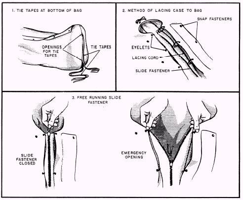 MOUNTAIN SLEEPING BAG The mountain sleeping bag (fig. 2-37) is a mummy-shaped bag with a quick-release slide fastener at the front opening. The bag has quilted construction and is filled with a mixture of down and feathers. The shape of the bag gives maximum warmth with minimum weight. A waterproof clothing bag is provided for carrying and storing. The bag is laced to an outer sleeping bag case, also shown in figure 2-37. The tie tapes at the bottom of the bag are used to fasten the bag at the bottom of the sleeping bag case and to secure the bag for packing after folding and rolling. The mountain sleeping bag is intended for use in locations where the temperatures range from 14F to 45F. Here are some useful hints on the care and use of the sleeping bag. l Always use the sleeping bag case to protect the bag and to provide extra warmth. l Keep the sleeping bag dry. Breathe through the face opening to keep your breath from wetting the bag. l Fluff the bag after unrolling. l Put padding under the bag for warmth and comfort. Use the pneumatic mattress, packboard, clothes, or fir boughs for padding. . Do not wear too many clothes when in the bag. Put some of them under the bag. l If your face is too cold, cover it with a towel or muffler. The bag is provided with a slide fastener. There are two methods of releasing this slide fastener. Under ordinary circumstances, pull the slide fastener down to release it. In an emergency, pull
