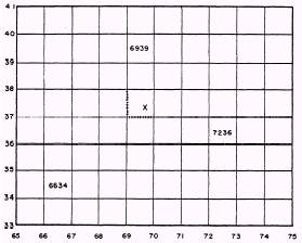 5-4.-Grid system. measurements. Military grids consist of two sets of equally spaced parallel, straight lines intersecting at right angles and forming a series of squares. Each grid line is an even interval of the selected measurement unit, such as yards or meters. A portion of a military grid, or map, is shown in figure 5-1. The dimensions and orientation of different types of grids vary, but all military grids have three things in common: 1. They are all true rectangular grids. 2. They are superimposed; that is, drawn on top of the geographic projection. 3. They permit linear and angular measurements. The regularly spaced lines that make up the grids on any large-scale map are divisions of the 100 000-meters square; the lines are spaced at 10 000- or 1000-meter intervals. Each of these lines is labeled at both ends with a number showing its relation to the origin of the zone. For the 1000-meter grid, except for the numbers labeling the first grid line in each direction from the southwest corner of the sheet, the last three digits (000) of the number are omitted. (See fig. 5-1.) Two digits of the numbers are printed in large type, and the same two digits appear at intervals along the grid line on the face of the map. They are called the PRINCIPAL DIGITS and represent the 10,000 and 1,000 digits of the grid number; they are of major importance to the map reader because they are numbers he uses most often for referencing points. The smaller digits complete the COORDINATES of the grid lines, but they are rarely used for point designation. On sheets with grid line spacing at 10000 meters, only one principal digit is shown, representing the 10,000 digit of the grid number.