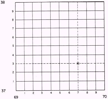 Figure 5-5.-Grid square, close-up. The designation of a point is based on the military principle of "Read RIGHT then UP." The precision desired determines the number of digits to be read beyond the principal digits. Remember that the term grid coordinate often indicates both the 100 000- meters-square identification and the desired number of digits. In many instances, it is a tactical requirement that the 100 000-meters-square identification be included in any point designation. Figure 5-4 shows a section of a simple grid system. Each line is numbered, starting at the lower left-hand corner, reading to the right and up. Remember, when you read a military map, you should always read from left to right and from bottom to top. Three squares in figure 5-4 have numbers in them to identify that particular grid square. The letter X has been placed in grid square 6937. To locate this point more precisely, see figure 5-5. You can see that the sides of the grid square have been divided into ten parts. This can be done by eye or with a scale. As shown in this figure, the X is located at coordinate 697373. The grid coordinates are written as one number but always contain an even number of digits. Examples are 6937 and 697373. |