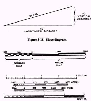 5-19.-Graphic scale. affected by the slope of the ground. Most equipment has a limit on the steepness of slope it can negotiate. So a more exact way of describing a slope is demanded. Slope may be expressed in several ways, but all of them depend upon a comparison of vertical distance (VD) to horizontal distance (HD) (fig. 5-18). VD is the difference between the highest and lowest elevations of the slope and is determined from the contour lines. HD is the horizontal ground distance between the highest and the lowest elevations of the slope. The VD and HD must be expressed in the same units. Both measurements must be made with extreme accuracy in order to have a valid determination of steepness. The computations normally are made for only the steepest part of a slope. |