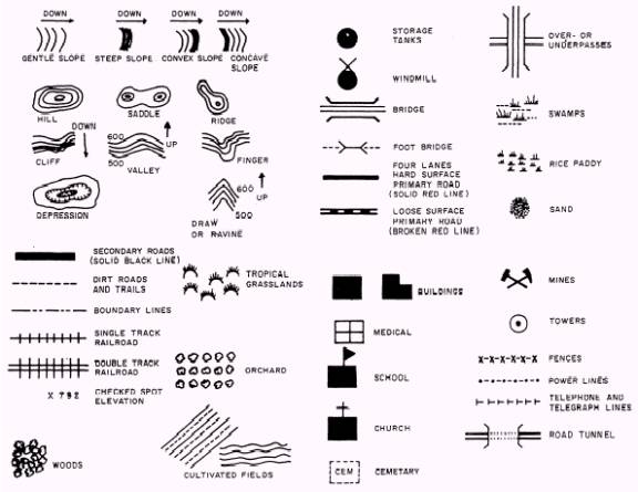 Figure 5-22.-Topographic symbols. pertinent features properly positioned. Ideally, all features within an area would appear on the map in their true proportion, position, and shape. However, this is not practical. Many of the features would be-unimportant and others could not be recognized because of their reduction in size. Therefore, the map maker has been forced to use symbols to represent these features. These symbols resemble, as closely as possible, the actual features themselves. (See fig. 5-22.) Topographic symbols are usually printed in a number of standardized colors. This is done so the features on the map are easier to identify and to give them a more natural appearance and contrast. Black-the majority of cultural or man-made features Blue-water features, such as lakes, rivers, and Swamps Green-vegetation, such as woods, orchards, or vineyards Brown-all relief features, such as contours Red-main roads, built up areas, and special features Others-occasionally used to show special information; generally, explained in the marginal notes |
