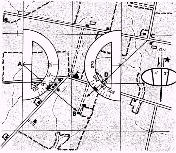 Figure 5-34.-Measuring an azimuth on a map. divide a circle into units of angular measure; and regardless of their shape, they consist of a scale around the outer edge and an index mark The INDEX MARK is the center of the protractor circle from which all the direction lines radiate. To determine the grid azimuth of a line from one point to another on the map (from A to B or C to D), refer to figure 5-34 as you study the following: 1. Draw a line connecting the two points. 2. Place the index of the protractor at the point where the line crosses a vertical (north-south) grid line. 3. Keeping the index at this point, align the 0-180 line of the protractor on the vertical grid line. 4. Read the value of the angle from the scale; this is the grid azimuth of the point. To plot a direction line from a known point on a map, refer to figure 5-35 as you study the following: 1. Convert, if necessary, the direction to azimuth. 2. Construct a north-south grid line through the known point. Then proceed in the following steps: l First, approximately align the 0- 180 line of the protractor in a north-south direction through the known point.