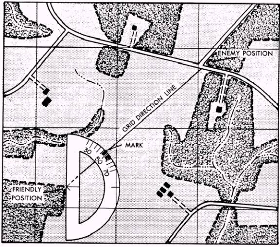 Figure 5-35.-Plotting an azimuth on a map. l Second, holding the 0 - 180 line of the protractor on the known point, slide the protractor in the north-south direction. Slide it until the horizontal line of the protractor (connecting the protractor index and the 90 tick mark) is aligned on an east-west grid line. l Draw a line connecting 0, the known point, and 180. l Holding the 0 - 180 line coincident with this line, slide the protractor index to the known point. l Make a mark on the map at the required angle. l Draw a line from the known point through the mark made on the map. This is the GRID DIRECTiON line. |