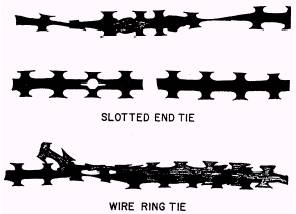 Double-Apron Fence The standard double-apron fence is one of the best obstacles that can be made with barbed tape. The effectiveness of this obstacle is increased by (1) raising the top wire to preclude crossing the obstacle by stepping over it and (2) placing low wires 4 inches above the ground to prevent personnel from crawling under the obstacle. Tying Procedures In tying barbed tape, use the wraparound tie (fig. 8-7), since the sharp bends of other ties weaken the tape. Steel-wire rings, crimped on, provide effective ties and may be used where available (fig. 8-8). Splices Connecting slots at each end of a 164-foot reel provide a quick method of splicing reels of barbed tape