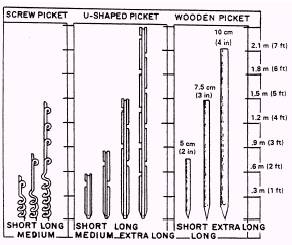 Figure 8-10.-Pickets for use with barbed wire. (fig. 8-9). You can also splice barbed tape by interlocking the twisted barbs of two separate lengths, then completing the splice by affixing one steel-wire ring to each end of the area where spliced (fig. 8-9). |