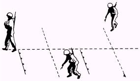 Figure 8-21.-Laying out anchor pickets, available and the first operation has moved far enough ahead to avoid congestion. A platoon is normally assigned to build a 984-foot section. Phase One Divide the working party, if not organized in three squads, into three groups of approximately equal size. One squad lays out the long pickets along the center line of the fence at 4-pace intervals at the spots where they are to be installed and with their points toward the enemy. Another squad lays out the anchor pickets with points toward the enemy and positioned 2 paces each way from the center line and midway between the long pickets (fig. 8-21). The spacing is readily checked with along picket. The third squad installs all the pickets with the help of the two other squads, as the latter finishes the work of laying out the pickets. When installed, the lower notch or bottom eye of the long pickets should be approximately 4 inches off the ground to make passage difficult either over or under the bottom wires. Phase Two As the groups complete the first operation, they return to the head of the fence and begin installing wire. The order in which the wires are installed is shown in figure 8-20 and is further illustrated in figure 8-22. Take care to avoid having any of the men cutoff between the fence and the enemy. Divide the men into two- or four-man groups and have them proceed to install the wires in numerical order; that is, as soon as the men installing one wire have moved away from the beginning of the fence and are out of the way, the next wire should be started. Installation is as follows: 1. The No. 1 wire is the diagonal wire on the enemy side and is secured with a top-eye tie to all pickets. It is important to keep this wire tight.