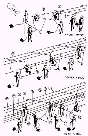 Figure 8-20.-Double-apron fence. 4- and 2-pace fence (fig. 8-20) is the better obstacle of the two and is the type more commonly used. In this fence, the center pickets are 4 paces apart and the anchor pickets are 2 paces from the line of the center pickets and opposite the midpoint of the space between center pickets. The 6- and 3-pace fence follows the same pattern with pickets at 6- and 3-pace intervals. For this fence, less material and construction time are required, but the obstacle effect is substantially reduced, because with the longer wire spans, it is easier to raise the lower wires and crawl over or under them. Except for picket spacing, the 4- and 2-pace and the 6- and 3-pace fences are identical. Only the 4- and 2-pace fence is discussed in detail. A 984-foot section of either type of double-apron fence is a platoon task normally requiring 1 1/2 hours, assuming 36 productive men per platoon. There are two operations in building a double-apron fence: (1) laying out and installing pickets and (2) installing wire. The first operation is nearly completed before starting the second. The second operation is started as men become