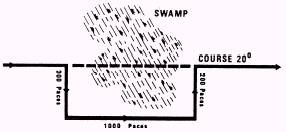 Figure 6-3.-Compensating by paces and right angles. your dog tags. If you are not able to identify yourself as a serviceman, you maybe treated as a spy, if captured. You may also be refused assistance by escape organizations or friendly locals. Do not leave or throw away articles that, if found would reveal your presence. Bury or otherwise dispose of the effects of your campsite; otherwise, these effects could give the enemy a clear picture of your direction of travel. Practice supply economy. The same jacket or pair of shoes may have to be used throughout the entire evasion trip. This may cover hundreds of cross-country miles during both winter and summer seasons. Build up your food and water supplies and ration them carefully so they last until you can reach an evasion objective or replenish them or both. Use firearms only in an emergency, and keep them concealed at all times during your evasion unless a situation arises that requires a show of arms. Avoid people as long as possible. However, if you find that you can no longer hope to go ahead on your own because of sickness, lack of food, or other compelling reasons, then, and only then, should you seek help from the local populace. Assistance may come from individual locals who are sympathetic to the Allied cause or from members of the underground who operate escape lines for the purpose of returning evaders to friendly forces. You must be wary when contacting locals regardless of what they claim to be. When you are fortunate enough to travel through an area where an organized escape line exists, the chances are good that a spotter will seek you out. Spotters for resistance or underground organizations are particularly alert when they have reason to believe that friendly forces are in their area. But this also applies to the enemy police and counterintelligence agents. Persons wearing civilian clothing in enemy-held territory are not necessarily civilians; many enemy soldiers have been found disguised as civilians. |