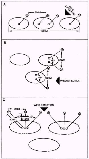 9-7.-Dep1oyment of automatic chemical agent alarms. Figure 9-7, view A, shows a situation where four detectors are emplaced with three platoons online. Note the orientation on the wind direction. The detector is oriented on wind direction, not on the direction of the enemy. When the automatic chemical agent alarms are mounted on vehicles, consideration must be given to wind direction for the protection of the main body. Figure 9-7, view B, shows an array using four detectors with the wind direction coming from the right flank of the unit. A significant difference between a four-detector may and a six-detector array is that with