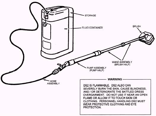 Portable Decontaminating Apparatus, DS2 The ABC-Ml1 apparatus (fig. 9-8) decontaminates small areas, such as the steering wheel or other equipment, that Seabees must touch. It is a steel container with an aluminum spray-head assembly and a nitrogen-gas cylinder that provides the pressure. It is filled with 11/3 quarts of DS2, which is sufficient for covering 135 square feet. The effective spray range is 6 to 8 feet. After each use, refill the Ml1 with DS2 and fit it with a new nitrogen cylinder. It is now ready to use again. M13