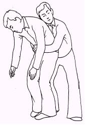 10-5.-Position for standing abdominal thrust. clear away the matter by inserting a finger into the mouth and gently sweeping from the inside of one cheek to the other. Be careful not to force the material into the victim's throat. Next, reposition the victim's head, ensuring an open airway, and place your ear next to the victim's nose and mouth. While in this position, listen and feel for air exchange, and look at the victim's chest and abdomen for movement. If the airway is still obstructed, it may be necessary to try to remove the obstruction by using the abdominal thrust or chest thrust methods. |