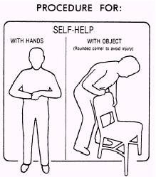 10-8.-Procedure for self-help. heart will soon stop beating. In such instances, be prepared to start cardiopulmonary resuscitation (CPR). The signs of respiratory arrest are an absence of respiratory effort, a lack of detectable air movement through the nose or mouth, unconsciousness, and a bluish discoloration of the lips and nail beds. |