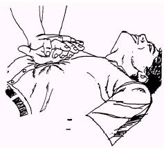 10-12.-Interlocking fingers to help keep fingers off the chest wall. off the xiphoid process (fig. 10-11). A fracture in this area could lacerate the liver. Place the heel of one hand directly on the lower half of the sternum two fingers up from the notch and the heel of the other on top of the first hand. Interlock your fingers or extend them straight out, and KEEP THEM OFF THE VICTIM'S CHEST! (See fig. 10-12.) With your elbows locked, apply vertical pressure straight down to depress the sternum (adult) from 1 1/2 to 2 inches. Then release the pressure, keeping the heels of your hands in place on his chest. This process compresses the heart between the sternum and the victim's back thus pumping blood to the vital parts of the body. When you use the proper technique, a more effective compression will result, and you will feel less fatigue. Ineffective compression occurs when the elbows of the rescuer are not locked, he is not directly over the sternum, or his hands are improperly placed on the sternum. When one rescuer performs CPR, the ratio of compressions to ventilations is 15 to 2, and it is performed at a rate of 80 compressions per minute. Vocalize "l, and 2, and 3," and so forth, until you reach 15. After 15 compressions, you must give the victim 2 ventilations. Continue for four full cycles of 15 compressions and 2 ventilations. Then take 5 seconds to check for the carotid pulse and spontaneous breathing. When there are still no signs of recovery, continue CPR. If a periodic check reveals a return of pulse and respiration, discontinue CPR; but closely monitor the victim's pulse and respirations, and be prepared to start CPR again, if required. When a pulse is present but no respiration, continue to give the victim one ventilation every 5 seconds and check his pulse frequently. Before moving on to the next technique, let us review the following steps for one-rescuer CPR: 1. Determine whether the victim is conscious. 2. Open the airway (it maybe necessary to remove the airway obstruction). 3. Look, listen, and feel. 4. Ventilate for four cycles. 5. Check his pulse-if none, call for help. 6. Begin the compression-ventilation ratio of 15 to 2 for four complete cycles. 7. Check again for a pulse and breathing. If no change, continue the compression-ventilation ratio of 15 to 2 until the victim is responsive, until you are properly relieved, until you can no longer continue because of exhaustion, or until the victim is pronounced dead by a medical officer. The diagrams in figures 10-13 and 10-14 show the step-by-step methods discussed in this chapter, and it serves as a good review. |
