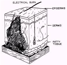 Figure 10-46.-Electrical penetration of the skin. A drinking fountain maybe used to supply a steady stream of water. Hold the victim's head in a position that allows water to flow from the inside corner of the eye toward the outside. Do not allow the water to fall directly on the eye, nor use greater force than is necessary to keep the water flowing across the eye. CAUTION Never use chemical antidotes, such as vinegar, baking soda, or alcohol, in treating burns of the eye. After thorough irrigation, loosely cover both eyes with a clean dressing. The aftercare for all chemical burns is similar to that for thermal burns; cover the affected area and get the victim to a medical facility at once. |