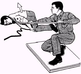Figure 10-47.-Pushing a victim away from a power line. When rescuing a victim who has come into direct contact with a power line, stand on a well-insulated object, and use a dry rope or a wooden pole to either push or pull the wire away from the victim or the victim away from the wire. (See fig. 10-47.) Do not touch the victim until this is done or you, too, may become a casualty. Electrical burns are often accompanied by respiratory failure and cardiac arrest, which are of more immediate danger to the victim than the bum itself. Start CPR immediately and continue until the victim regains a normal heartbeat and breathing pattern. Finally, lightly cover the site of the burn with a dry, preferably sterile dressing, treat for shock and transport the victim to a medical facility. |