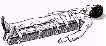 Figure 10-51.-Boards used as emergency splints for fractured thigh. The outside splint should reach from the armpit to the foot. Make sure the inside splint reaches from the crotch to the fret. The splints should be fastened in five places: (1) around the ankle, (2) over the knee, (3) just below the hip, (4) around the pelvis, and (5) just below the armpit. Both legs should be tied together to support the injured leg as firmly as possible. It is essential that a fractured thigh be splinted before the victim is moved. Ready-made splints are best, but improvised splints may be used. Figure 10-51 shows how boards may be used as an emergency splint for a fractured thigh. Remember, DO NOT MOVE THE VICTIM UNTIL THE INJURED LEG HAS BEEN IMMOBILIZED. Treat the victim for shock and obtain medical care as soon as possible. |