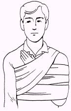 FRACTURE OF THE RIB When the ribs are broken, the victim should be kept comfortable and quiet so the greatest danger-the possibility of further damage to the lungs, heart, or chest wall by the broken ends-is minimized. The common finding in all victims with fractured ribs is pain localized at the fracture site. By asking the patient to point out the exact area of pain, you can often determine the location of the injury. There mayor may not be a rib deformity or chest wall contusion or laceration of the area. Deep breathing, coughing, or movement is usually painful. The patient generally wishes to remain still and may often lean toward the injured side, with one hand over the fractured area to immobilize the chest and to ease his pain. TREATMENT. In general, rib fractures are not bound, strapped, or taped when the victim is reasonably comfortable; however, they may be splinted by the use of external support. If the patient is considerably more comfortable with his chest immobilized, the best method is to use a swathe bandage (fig. 10-53) in which the arm on his injured side is strapped to his chest with the palm flat, the thumb up, and with the forearm raised to a 45-degree angle. Immobilize his chest, using wide